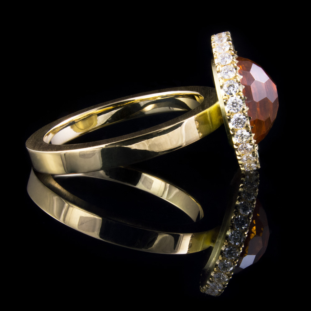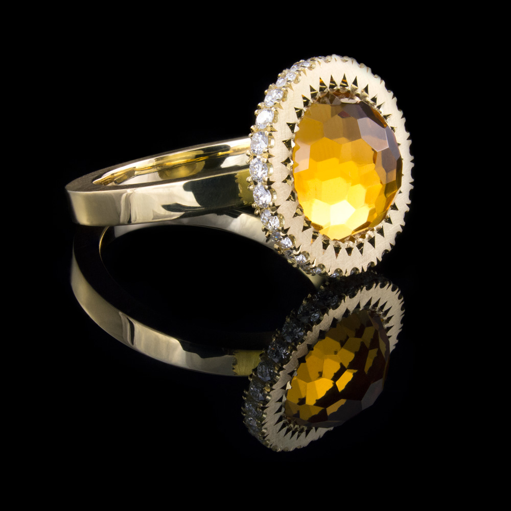 Handmade in 18ct yellow gold this dress ring is set with a 10mm round checkerboard cut citrine which is held by fine grains engraved into the surface of the setting. This creates some sparkle on an otherwise brushed surface. Surrounding this stunning centre stone are 1.5mm round white diamonds, castle set into the side of the setting, which makes for subtlety when viewed from the top, but really shines and sparkles when seen side on. Who says bling always has to be obvious?