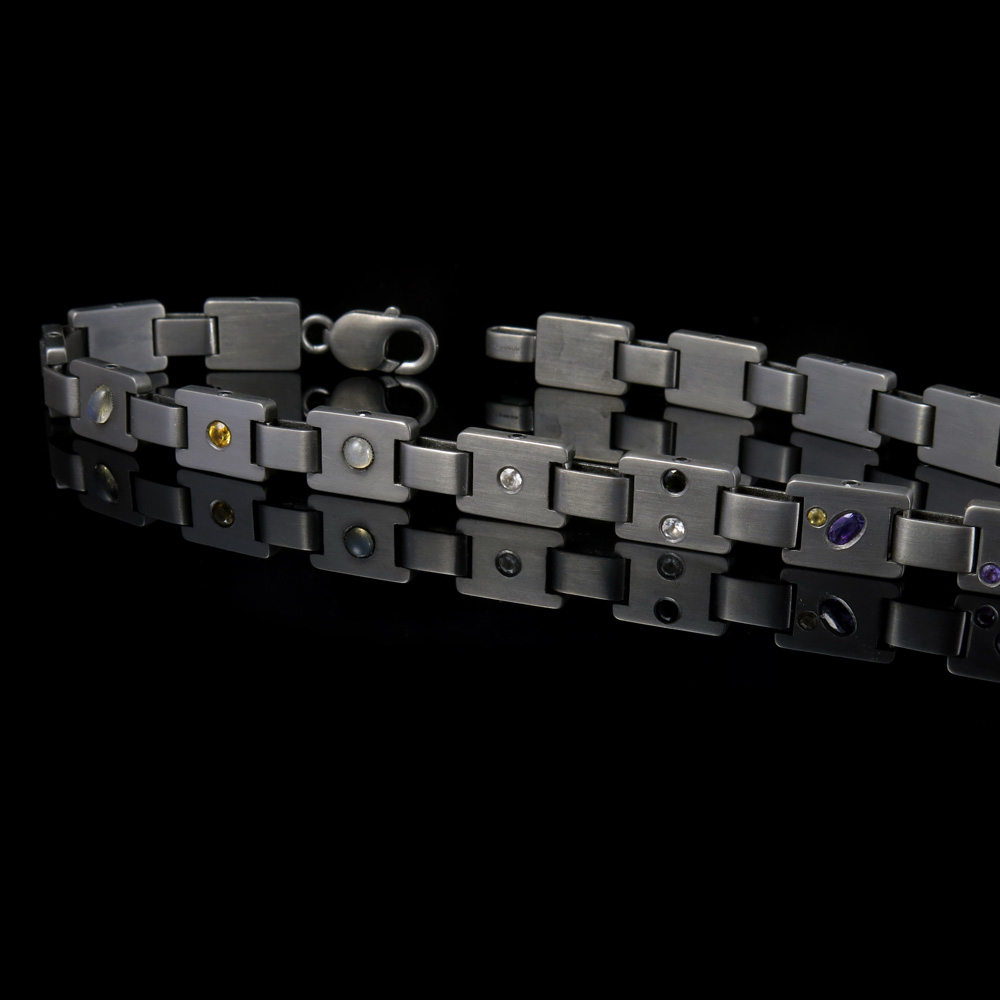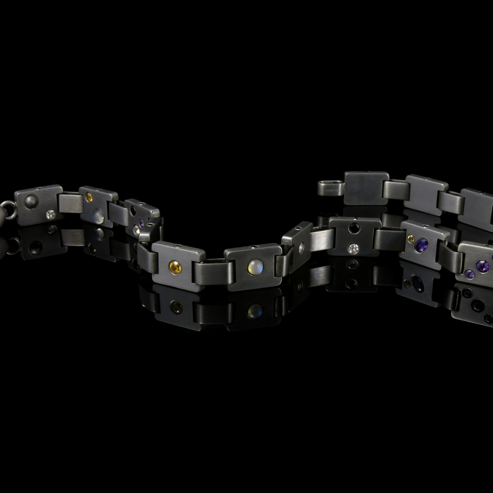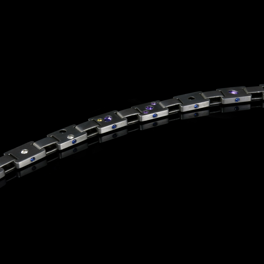 This double-length gent’s bracelet was a very involved piece. Isabelle’s client asked for a piece of jewellery that he could wear everyday, in a bold but subtle style and set with a variety of gemstones that were of sentimental value to him. It was made from 950 palladium as this is extremely hard wearing and each link was carefully hand pierced from sheet, matt finished and assembled, then set with a variety of cabouchon cut gemstones, including amethysts and citrines. Every link also has a small blue sapphire and black diamond set into the sides. The whole piece was then black rhodium plated.