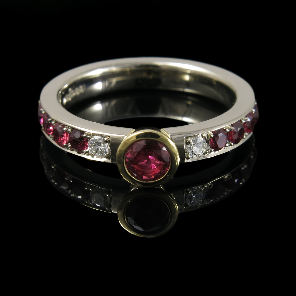 This ruby and diamond ring was made from 18 kt white and yellow gold, with the setting being made from the customer’s mother’s wedding band. The rubies and diamonds used were also from an existing piece of jewellery.