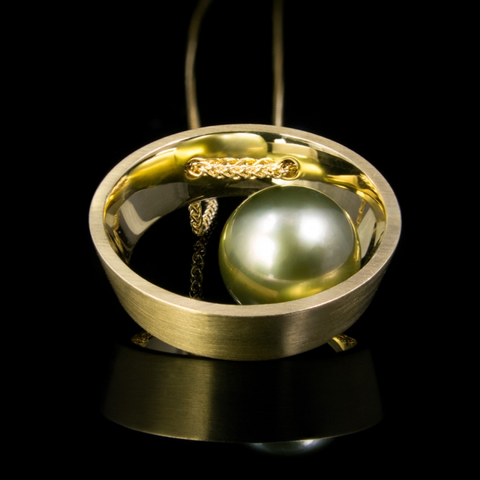 Handmade 18kt yellow gold pendant with a stunning green tahitian pearl. The pendant moves freely on the chain, adding to the lightness of the design whose star is the 8mm tahitian pearl.